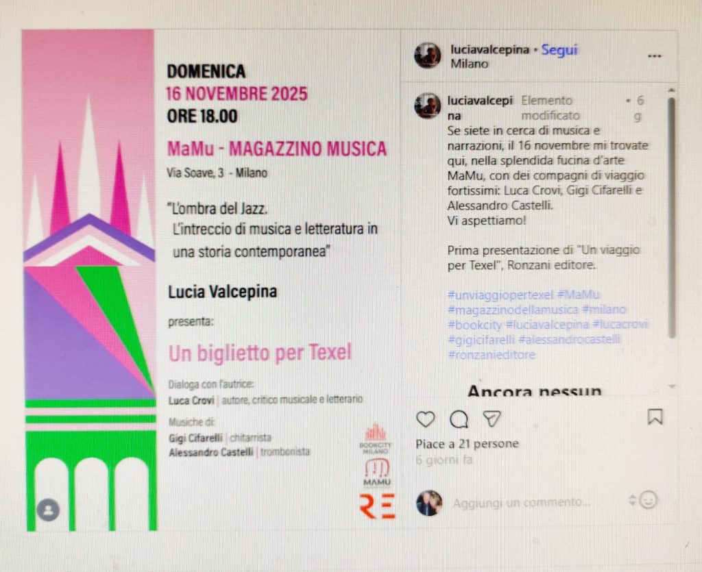 Lucia Valcepina presenta “Un biglietto per Texel” con musiche di Gigi Cifarelli e Alessandro Castelli (Tromba)